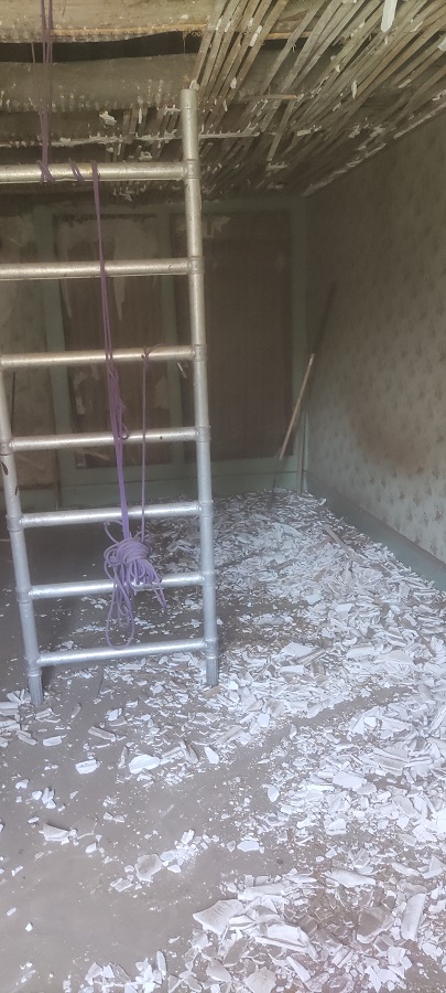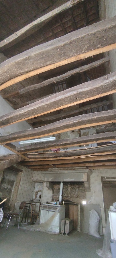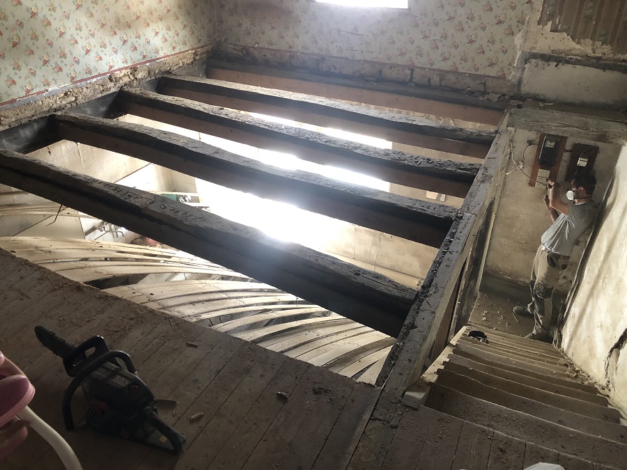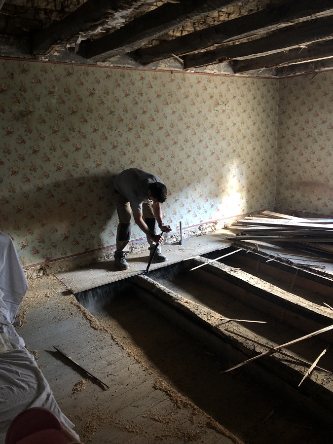 Pour éviter la poussière, nous avons vidé les espaces entre les poutres avant de faire tomber le plafond composé de lattis et de plâtre.