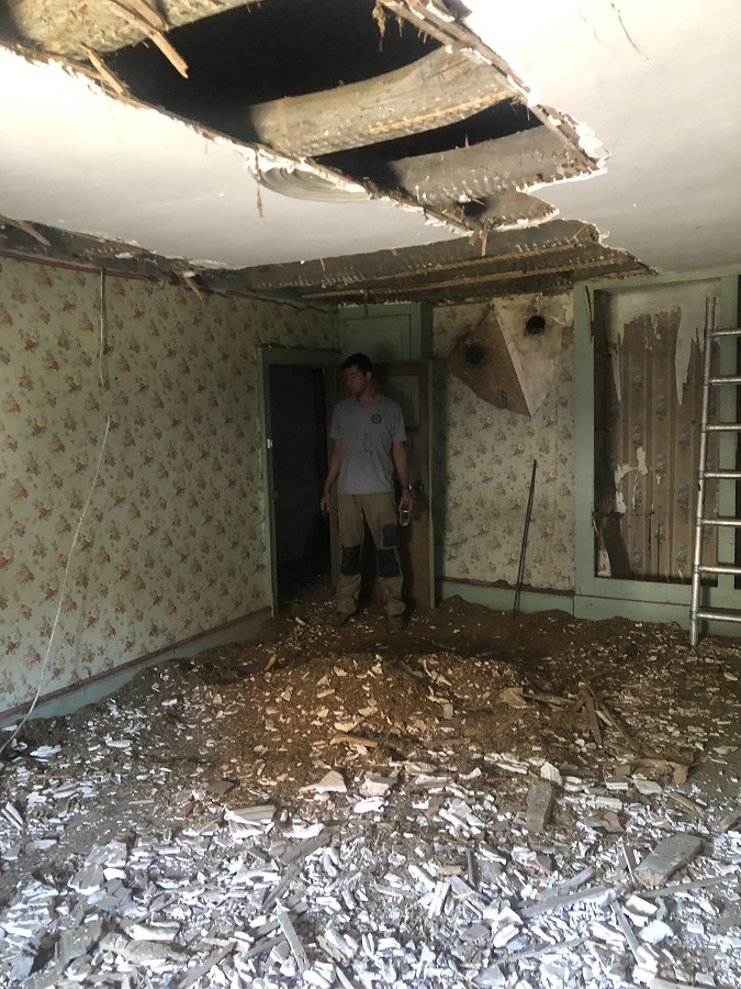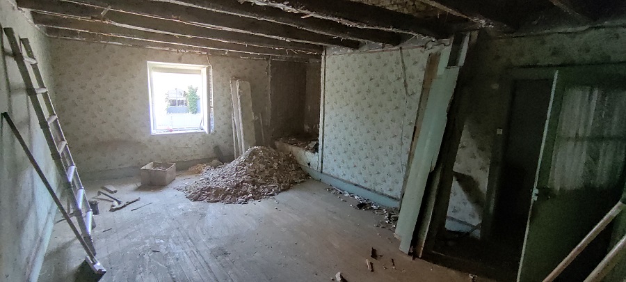 Après le 2ème étage, nous avons commencé la démolition du 1er étage. Comme on se doutait, le plafond entre la chambre et le grenier était lui aussi rempli d’avoine.