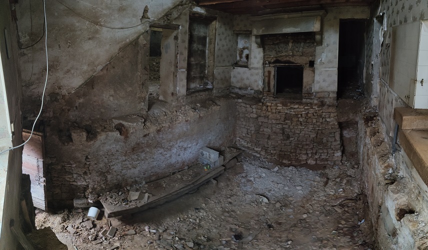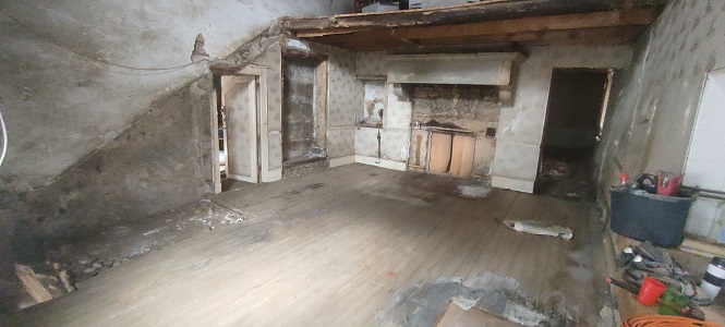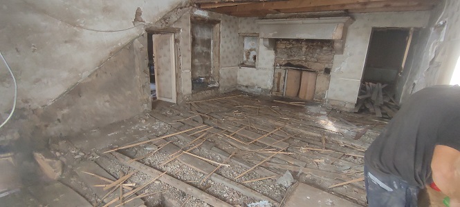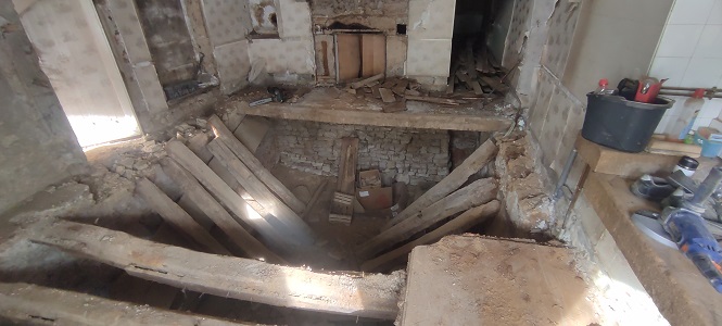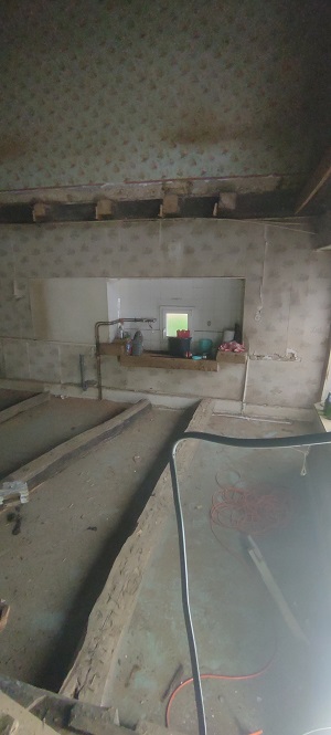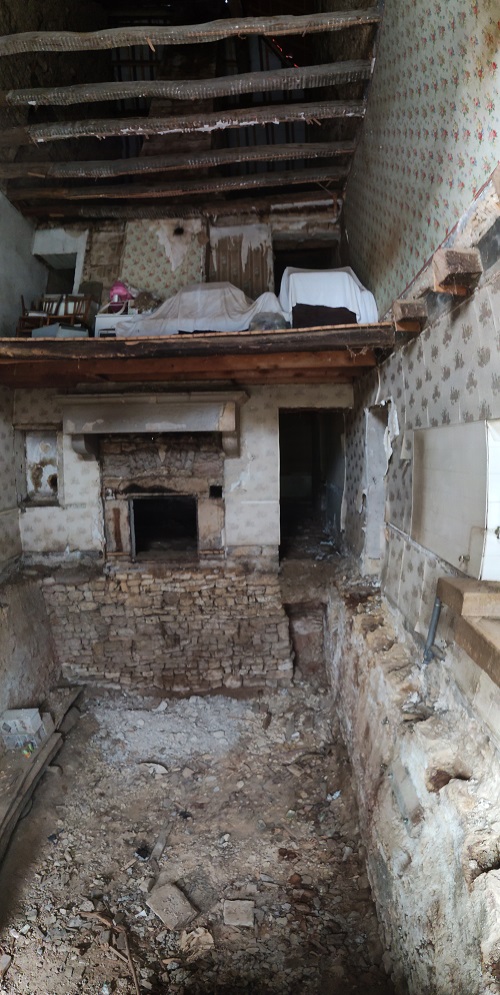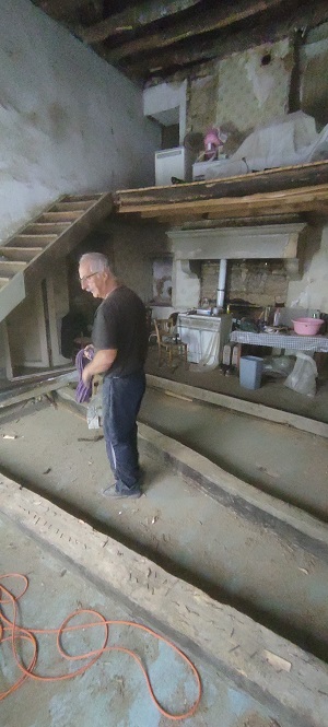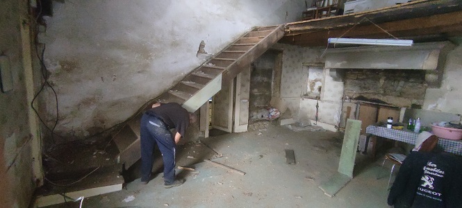 Nous sommes fin Octobre 2022, on fait tomber une partie des poutres du plafond de la cuisine et on retire l’escalier.