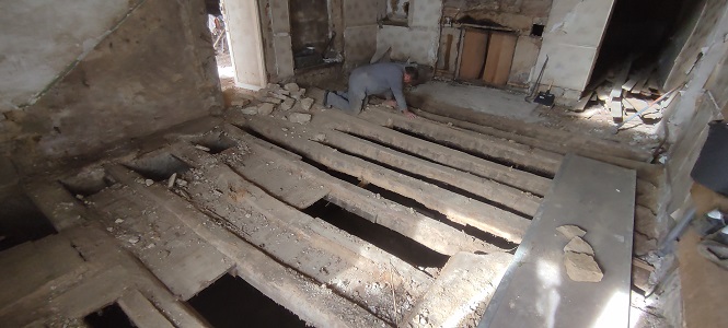 Ensuite on s’attaque au retrait des planchers de la cuisine et du salon.