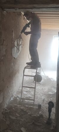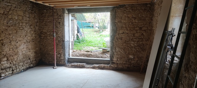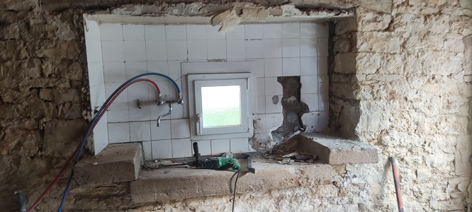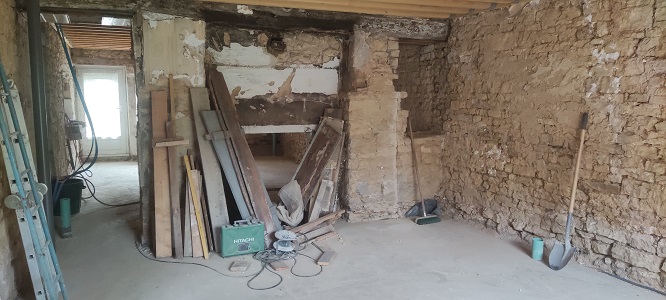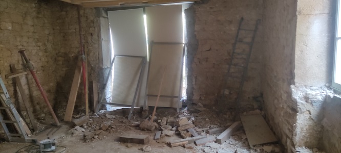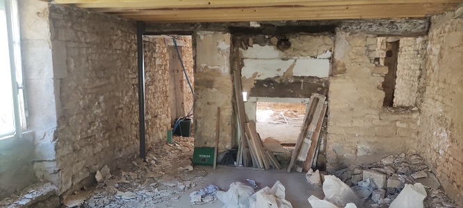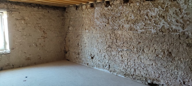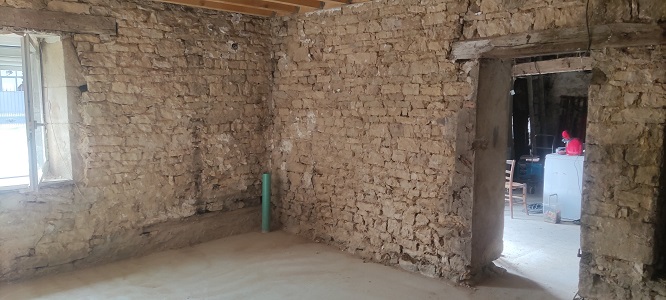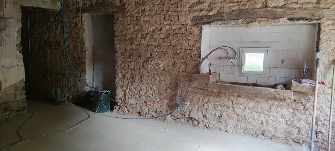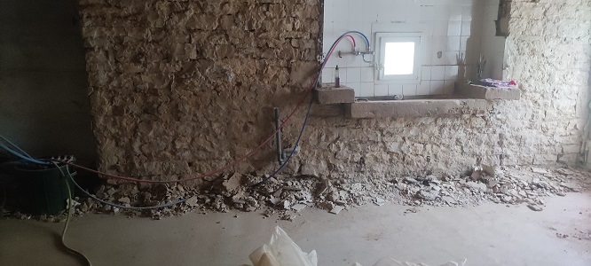 Beaucoup d’heures et de sueurs pour en arriver là, mais la totalité des murs de la partie habitation s’est vu dépossédée des reliquats de plâtres, ciment, ou autres revêtements exotique…