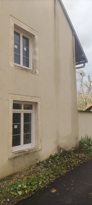 Respectant la directive des ABF (car je vous rappelle que la maison se situe dans le giron d’une église classée), nous avons donc de belles fenêtres RAL 7035 (gris en fait, très clair), doubles vantaux avec séparations.
